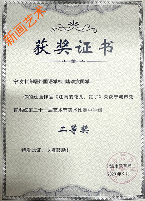 ■【荣誉证书】宁波市海曙外国语学校陆瑜宸同学:你的绘画作品《江南的花儿,红了》荣获宁波市教育系统第二十一届艺术节美术比赛中学组二等奖。特发此证,以资鼓励。宁波市教育局2023年9月