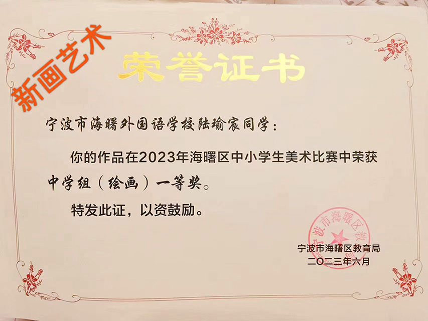 ■【荣誉证书】宁波市海曙外国语学校陆瑜宸同学:你的作品在2023年宁波市海曙区中小学生美术比赛中荣获中学组(绘画)一等奖。特发此证,以资鼓励。宁波市海曙区教育局2023年6月