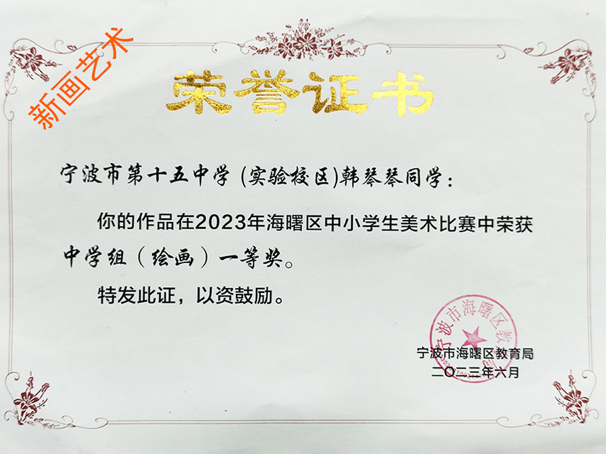 ■【荣誉证书】宁波市十五中学韩琴琴同学,你的作品在2023年宁波市海曙区中小学生美术比赛中荣获中学组(绘画)一等奖。特发此证,以资鼓励。宁波市海曙区教育局2023年6月